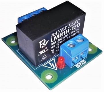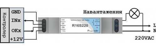 Напруга керування реле 12 вольт. Дозволена напруга комутації релейними клемами змінного струму 220 вольт, току 16 А. Застосування для управління електроприладами.